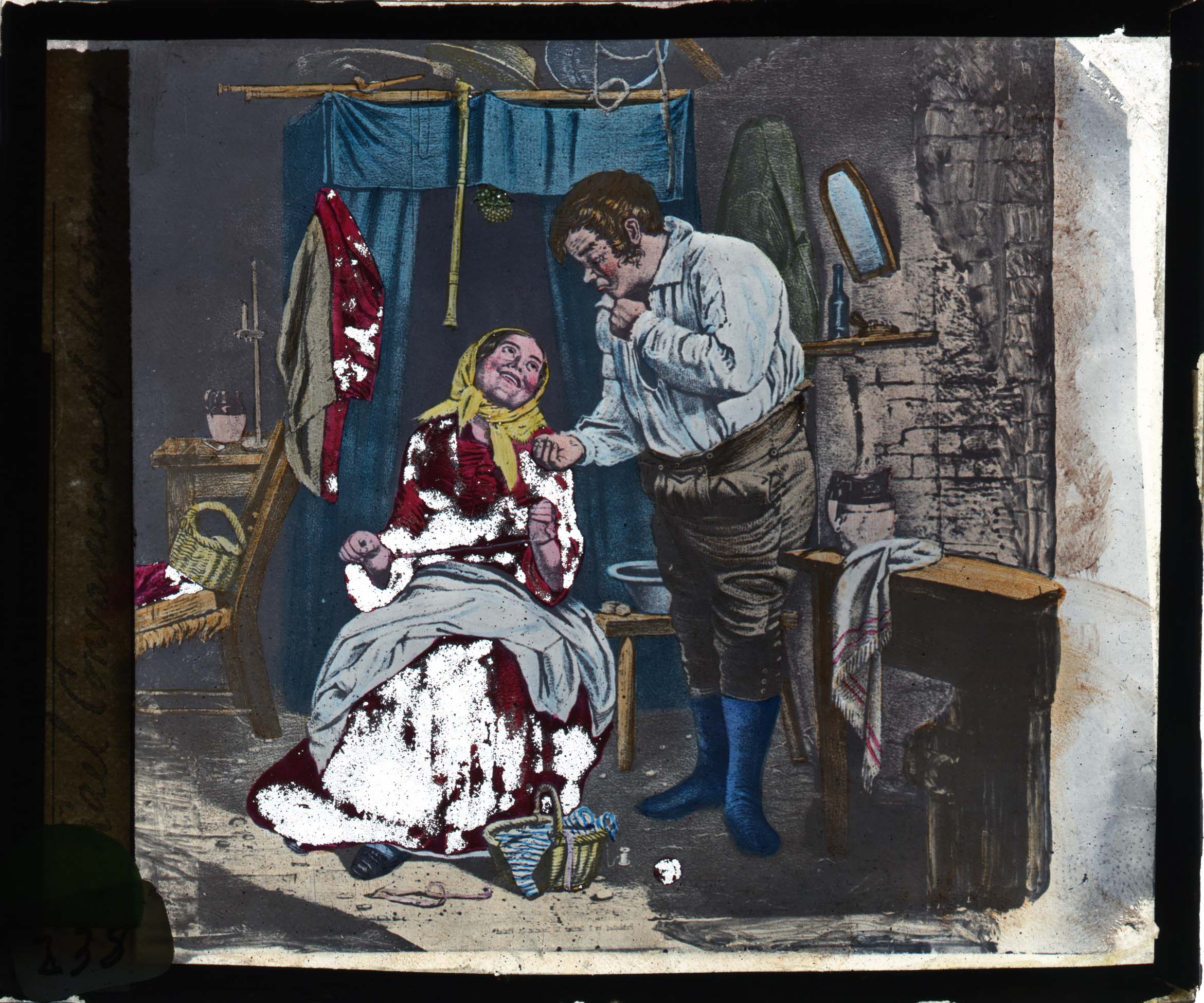 Slide 5 [Two men drowning; woman crying; a third man holding an umbrella]